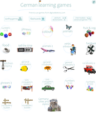 ![]() | ... is an aged website for learning languages through games and graphics. As a result of its age, some games no longer work in modern web browsers. German is one of several dozen languages taught at the site. The focus is mainly on developing vocabulary. This collection of flashcards, picture dictionaries, simple matching games and spelling quizzes is ideal for beginners and intermediate learners of German. Though easy to use for small kids, most of the content is suitable only for school-age children as they must be able to read the words. | https://www.digitaldialects.com/German.htm |